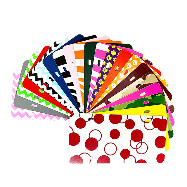 Custom or personalized license plates are a great vehicle for custom graphics. These plastic license plate blanks made of high-density polyurethane are lightweight and durable, and come in 27 patterns and colors that include popular and quirky patterns like camo, zebra, paw prints, polka dots and more. The solid color blanks are colored on the front and back, while the patterned plates only feature the pattern on the front side. Show your school spirit, boost your favorite team, or just create a personalized look for cars, bikes, ATVs, trucks and well, anything else that you want to personalize with a license plate blank. Whether it's patriotic, athletic, religious, artistic, or personal - our license plates can be customized to target any market or can be made just for your friends and family. These blanks are ready for you to apply your own letters, logos or graphics and are easy to attach to your vehicle or on the wall, etc. Unleash your creativity and allow customers to have endless options with custom license plates.