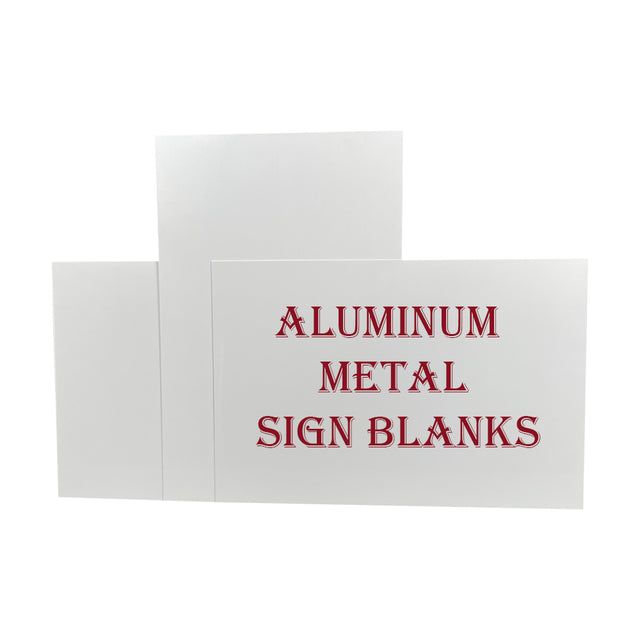 Aluminum metal sign blanks are sign shop staples because they are ideal for all kinds of applications. These aluminum sign blanks are prefinished with a durable wax free baked enamel that allows for easy application of vinyl lettering and graphics. These aluminum metal sign blanks feature square corners and are available in the most requested color, white. They come with one side masked for ultimate protection and are available in three popular sizes making them a perfect substrate for a wide variety of applications.