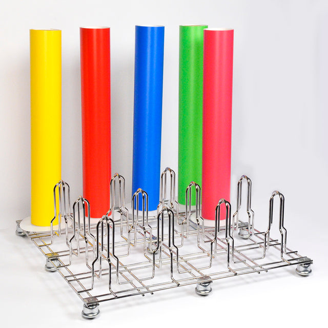 This rack is durable enough to hold up to 72 inch wide material with ease. The protective plastic rings prevent material damage, while storing your supplies. The rack is made of heavy gauge wire and constructed to hold 16 rolls of 2-3 inch core diameter material up to one thousand pounds. The unit has nine caster rollers to allow easy movement with the rack fully loaded. Dimensions : 30 inches x 30 inches x 15 inches